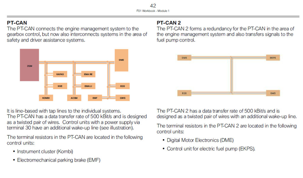 Unfortunately, in some place the documentation is controversial. For example, in the description for F01 is mentioned, that K CAN 2 has two terminal resistors, which are located in ZGM and JB electronic modules (F01 Workbook, page 41). Obviously, 2 sets of terminal transistors are described, and in other modules CAN “load” modules could be not present (are not present).