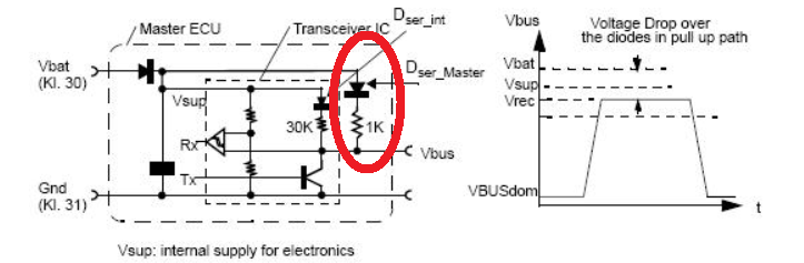 Network power supply, marked with red – terminal resistors, which are placed in current modules. This resistor for sure is located in Master module; if the network contains also Power-up devices (which ensure “awakening” of the car) – also these devices contain such resistors (to ensure normal performance of the network in the moment, when the car “wakes up”).