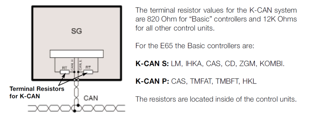 - terminal resistors: 120 Ohm; 2 pieces – in the beginning, and end of the interface (older: E65) or included in blocks/inside (E60+).