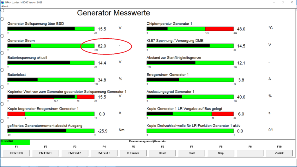 Here you will find test-bits of the alternator, and also you can activate a alternator’s self-test. During the test, DME will sequently change the voltage, required by a alternator (15.0/14.5/14.0/13.0 V) and will analyze its performance. True thou, this test doesn’t check the ability of max current.