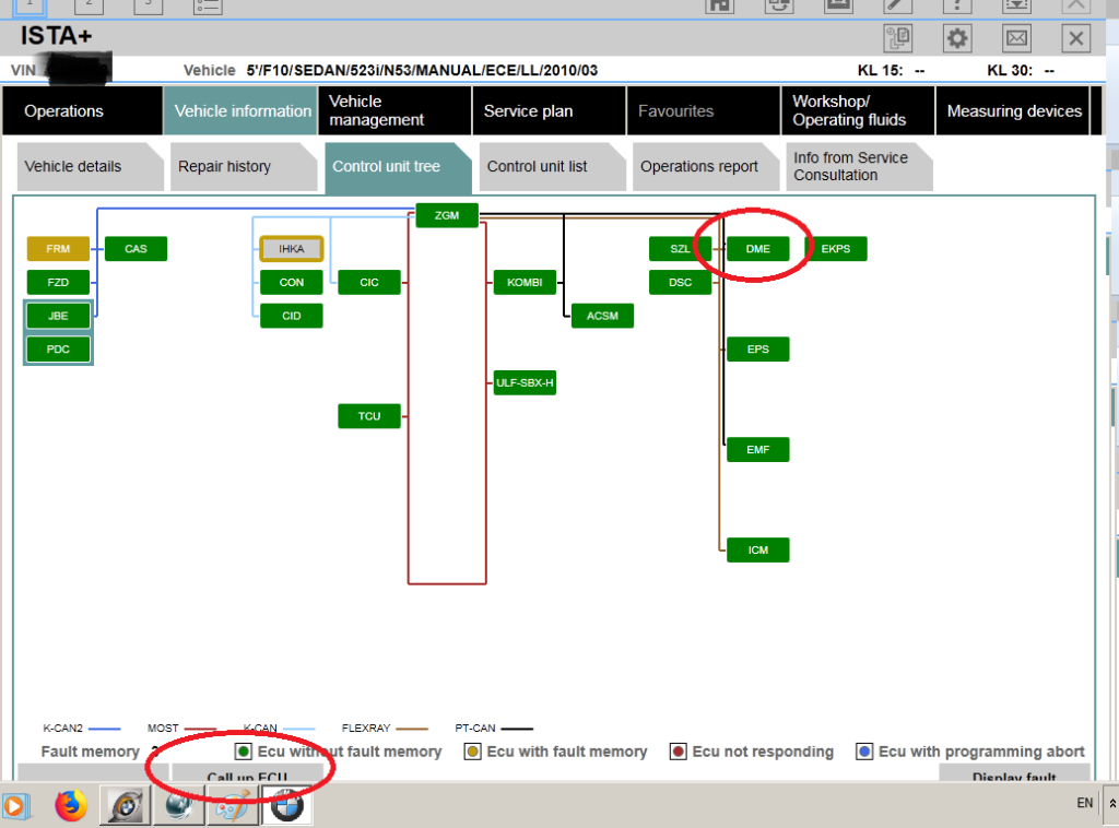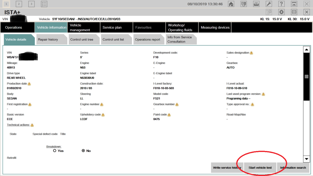 - Start a new session in ISTA D/+, perform the identification of the vehicle and a test: