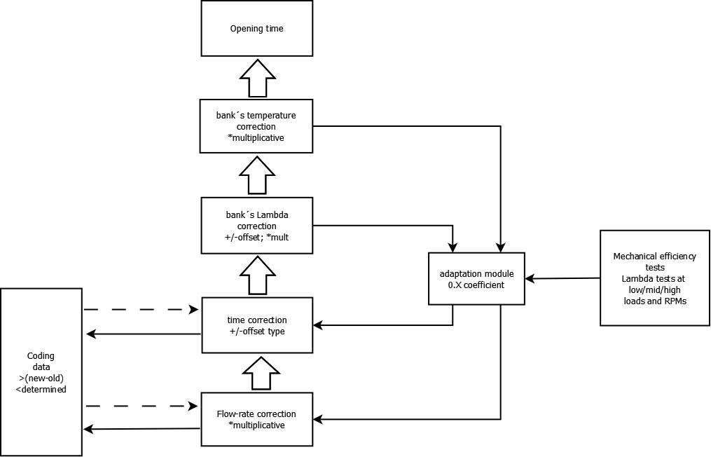 As we see, data from a head module of Lambda correction of the banks and from temperature additional correction module are directed to adaptation module, which affects individual data of each injector. These corrections are characteristic for newer software releases and perform the following function: