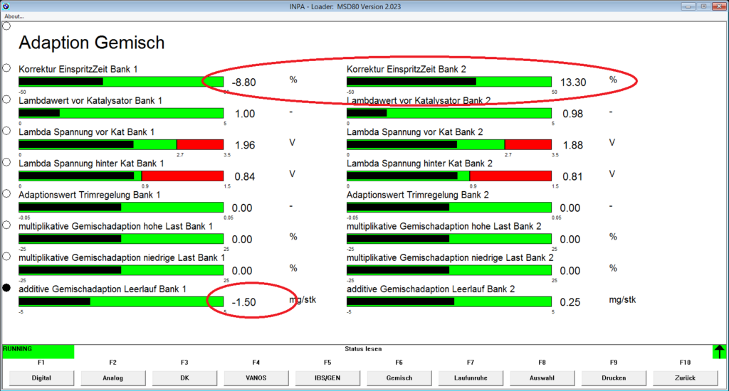 If the fuel mixture in the range of the whole bank is correct, the only option: in cylinders, which injectors are leaking, the fuel mixture is rich. In cylinders, which injectors are not leaking, the fuel mixture is lean. Of course, as the N53 series engine has 3 cylinders in one bank, the following situation can occur: injector of one cylinder is leaking strongly, other – leaking much less, in it the fuel mixture is either rich or lean, in the third cylinder, which injector is not leaking – the fuel mixture is lean.