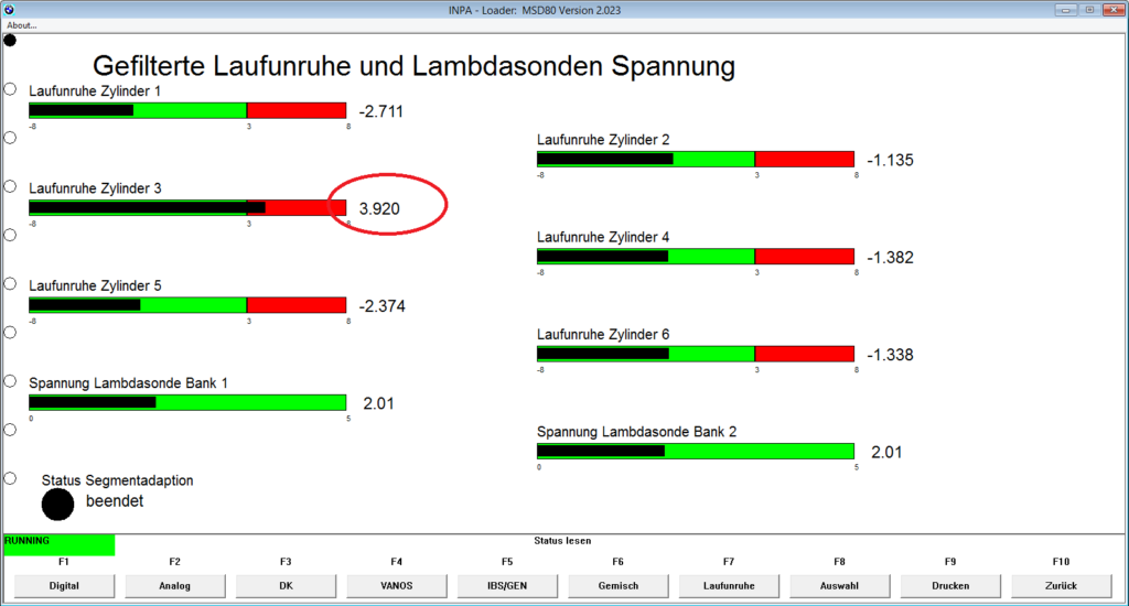 With bank No.2 (on the right side of the menu) everything looks fine. Mechanical efficiency of all cylinders – similar. Bank No.1 (on the left side of the menu) has problems. Remember – in the Rough run menu, cylinders are displayed in firing order.