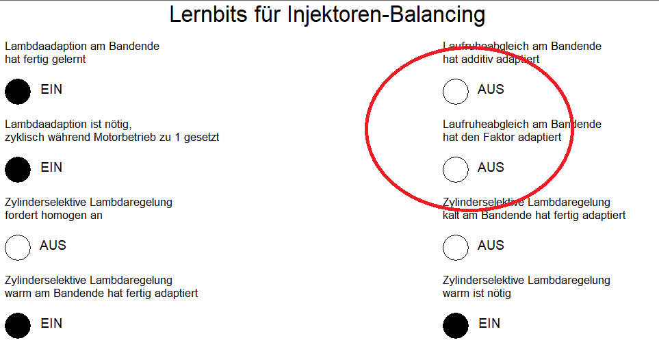 First two learnbits of the second column are not colored! If the engine would have run in Stratified charge for at least 10 .. 15 minutes after last deleting of the adaptations, these learnbits (Lambda adaptations for Stratified charge) would be colored.