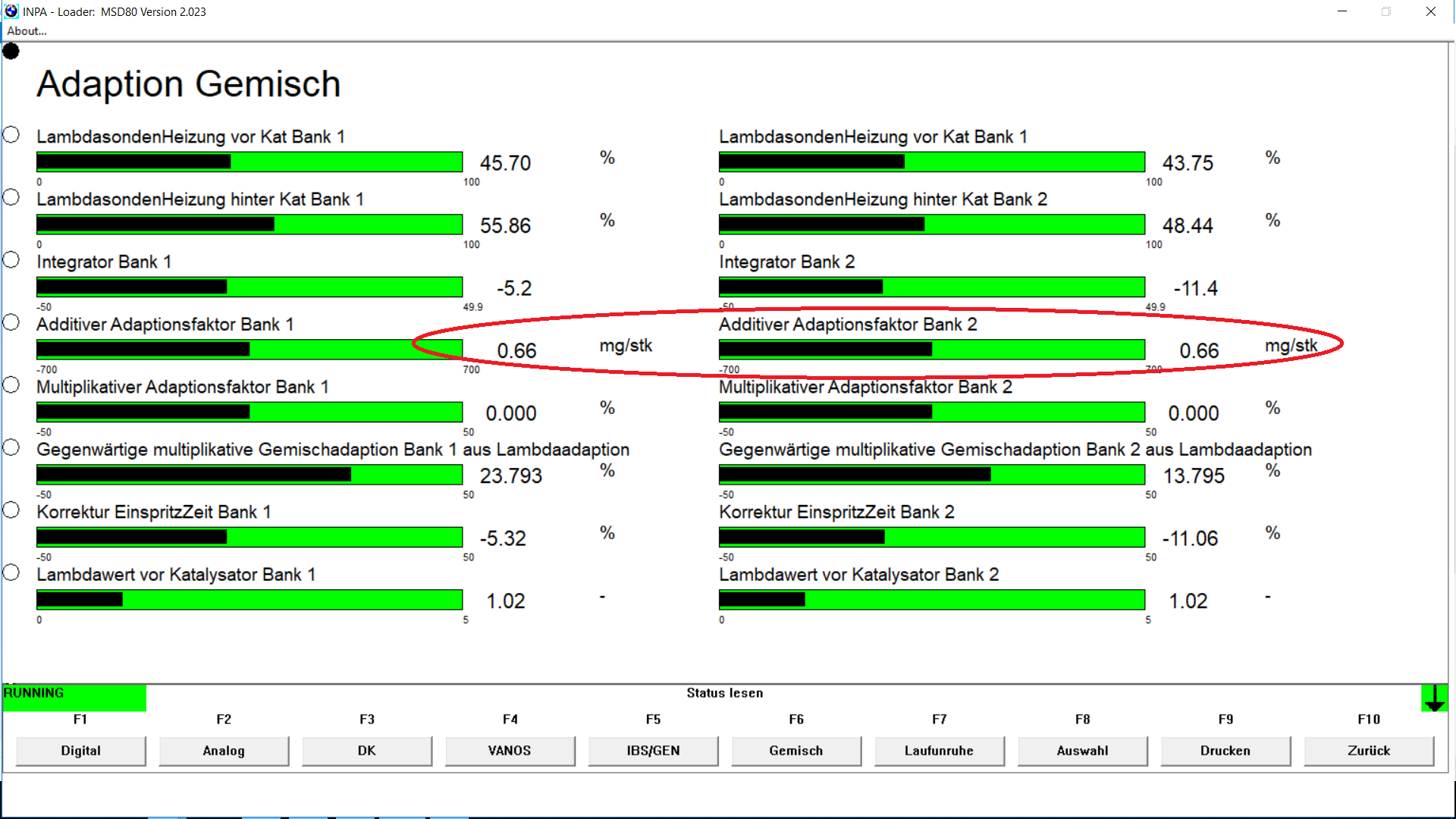 At the second part of the entry, I will explain, how the MSD80 acts, if it detects problems with oil pressure. Fuel mixture (../F5/F6) data shows, that MSD immediately equalizes offset type LTFT of both banks:
